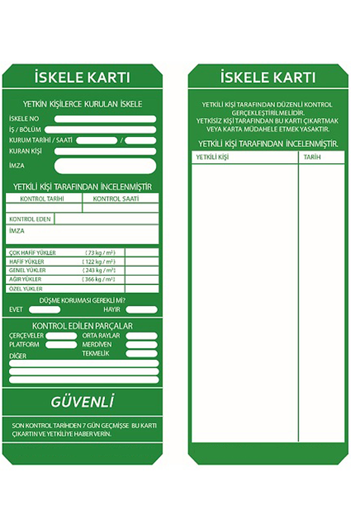 Yeşil - Bu renk etiketi, iskele kullanım amacı için güvenli olduğunu gösterir.